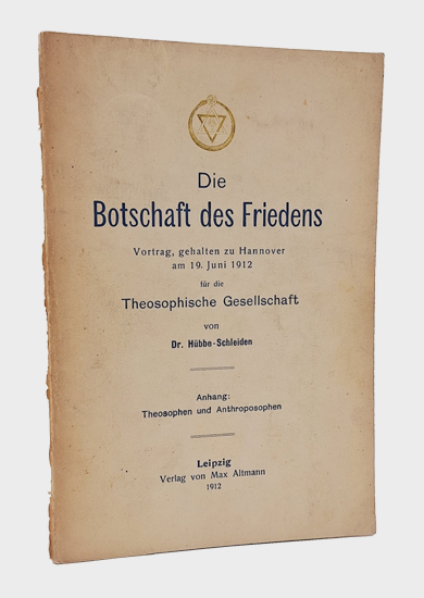Hübbe-Schleiden, Dr. [Wilhelm]: Die Botschaft des Friedens. Anhang: Theosophen Und Anthroposophen. Verlag von Max Altmann, Leipzig 1912. 42 S., 2 Bl. OKarton.