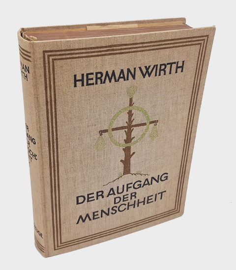 Wirth, Hermann: Der Aufgang der Menschheit. Untersuchungen zur Geschichte der Religion, Symbolik und Schrift der atlantisch-nordischen Rasse. Textband I. Die Grundzüge. (alles Erschienene). Verlegt bei Eugen Diederichs, Jena 1928. Erstes und zweites Tausend. 4°. Titelzeichnung mit der Queste von Max Thalmann. Mit 68 Textabbildungen, 28 Bildbeilagen und einem Schrifttafelanhang. 1 Tafel, 2 Bl., 632 S. Illustr. OLwd.
