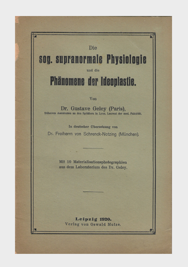 Die sog. supranormale Physiologie und die Phänomene der Ideoplastie. Verlag von Oswald Mutze, Leipzig 1920. In deutscher Übersetzung von Dr. Freiherrn von Schrenck-Notzing (München). Mit 10 Materialisationsphotographien aus dem Laboratorium des Dr. Geley. 30 S. 1 Bl. OKarton.