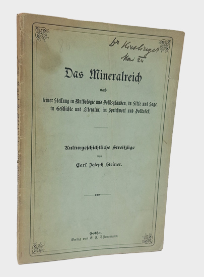Steiner,Carl Joseph: Das Mineralreich nach seiner Stellung in Mythologie und Volksglauben, in Sitte und Sage, in Geschichte und Litteratur, im Sprichwort und Volksfest. Kulturgeschichtliche Streifzüge. Verlag von E. F. Thienemann, Gotha 1895. X, 142 S. OBroschur.