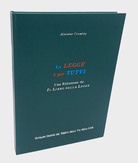 La Legge è per Tutti. Una Riduzione de Il Libro Della Legge. Pubblicato per Ordine Del, Novara o.J. [ca. 1997]. 4° [303 x 218 mm]. Con due illustrazioni a colori della Stella della Rivelazione. xii, 309, 1 (w) S. Grüner Kunstledereinband mit mehrfarbiger Prägung.