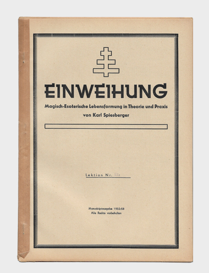 Einweihung. Magisch-esoterische Lebensformung in Theorie und Praxis. Lektion Nr. XX. Privatdruck / Manuskriptausgabe o.O., 1952/58. 4°. 1 Bl., 14 S. Typoskriptdruck mit Klammerheftung und Fälzelstreifen.