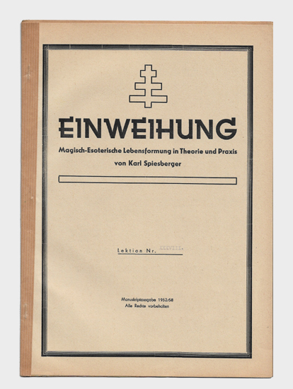 Einweihung. Magisch-esoterische Lebensformung in Theorie und Praxis. Lektion Nr. XXXVIII. Privatdruck / Manuskriptausgabe o.O., 1952/58. 4°. 1 Bl., 14 S. Typoskriptdruck mit Klammerheftung und Fälzelstreifen.