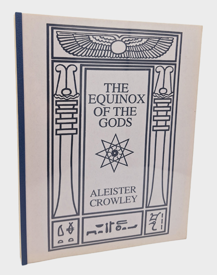 Crowley, Aleister (eigentl.: Edward Alexander C.): The Equinox of the Gods. O.T.O. and Stellar Visions, [San Francisco] 1986. First Edition. 4° [279 x 217 mm]. 7 S., v, 137, (1) S., 1 Bl., 22, 22, 22 S. Velobound. Flexible clear plastic front cover over printed paper cover sheet, dark blue plastic rear cover, secured together with a blue plastic back strip. Hand-colored endsheets.