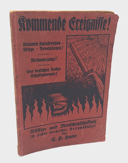 Huter, C[arl] H[einrich]: Kommende Ereignisse! Völker- und Menschenschicksale im Lichte kosmischer Gesetzmäßigkeit. Verlag E. Hußla, Nürnberg 1926. 11.-30. Tausend. 46 S. Illustr. OKarton.
