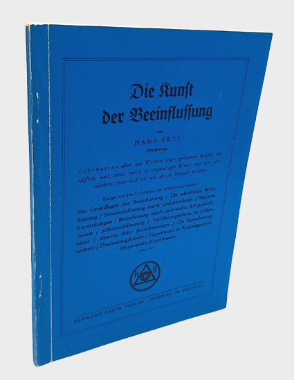 Ertl, Hans: Die Kunst der Beeinflussung. Lehrkursus Über das Wirken jener geheimen Kräfte, die täglich, und zwar meist in ungünstiger Weise, auf uns einwirken, ohne daß wir uns dessen bewußt werden. Hermann Bauer Verlag, Freiburg im Breisgau 1954. 63 S., 2 Bl. OKart.