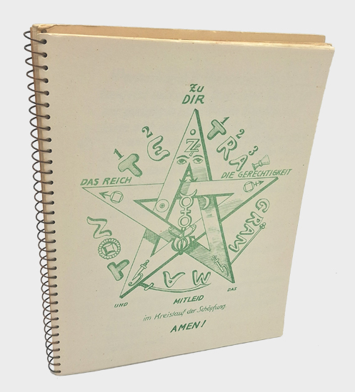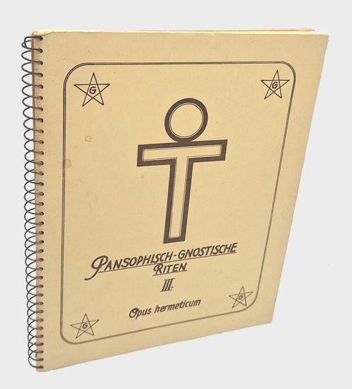 Pansophisch-Gnostische Riten III. Opus hermeticum. Im Selbstverlag des Herausgebers (Eduard Munninger), Burg Krämpelstein, Esternberg, Oberösterreich 1956. 7 Bl., 29 (einseitig bedruckte Bl.), 5 Bl. illustr. OKarton.