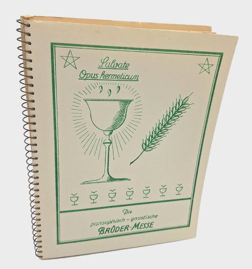 Dieses Ritual stammt vom Hierarch des “Antiquus arcanus Ordo rosae rubeae Crucis” (Alter geheimer Orden vom Kreuz der roten und goldenen Rose). Es enthält die “Pansophische Brüdermesse” und das “Liebesmahl”. Mit Inordinationen, Gnostischem Glaubensbekenntnis, Segnung der Altargaben, Preis dem Opfer (gr. Pariser Zauberpapyrus, 300 v. Chr.), Emporhebung der Gaben, Grals-Botschaft, Gebet des Paracelsus etc. etc. Beigegeben sind dem Band auch genaue Anweisungen und Erläuterungen zu den Ritentexten und deren Gebrauch beim Altardienst, sowie ein Verzeichnis weiterer pansophischer Ritenbücher. – Kartonage gering fleckig. Innendeckel mit Exlibris (Pater Adalbert = Erich Maria Beyer), sonst ein gutes Exemplar. Selten.