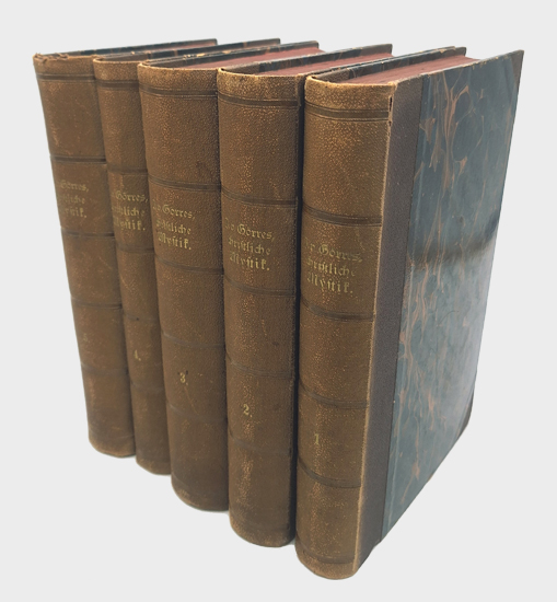 Görres, Joseph von: Die Christliche Mystik. (Erster bis fünfter Band). Druck und Verlag von Georg Joseph Manz, Regensburg 1879-1880. 8°. Mit dem Bildnisse des Verfassers (Band I). 1 Bl., XX, 495 S.; XX, 594 S., 1 Bl. Vlgs.-Anz.; XX, 737 S.; XXXI, 412 S.; XI, 692 S. OHalbleder-Bde. m. Rückengoldprägung.