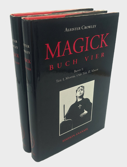 Crowley, Aleister (eigentl.: Edward Alexander C.): Magick. Buch Vier. (Liber ABA). (2 Bände). Edition Ananael, Verlag Michael Sperlhofer, Bad Ischl 1996. Ins Deutsche übertragen, mit Anmerkungen und einem Geleitwort versehen von Michael De Witt. Band I: Teil I, Mystik, und Teil II, Magie. Mit 1 Porträt und 14 Abbildungen im Text. 214, [1] Verlagsanzeigen, [1] w. S. – Band 2: Teil III, Magie in Theorie und Praxis. Mit 1 Porträt. 285, [1] w., [1] Verlagsanzeigen, [1] w. S. – Rote OPapp-Bände mit goldgeprägtem Rücken und illustriertem OUmschlag.