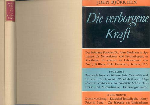 Björkhem, John: Die verborgene Kraft. Probleme der Parapsychologie. Olten u. Freiburg, Walter 1954. Aus dem Schwedischen Übers. von Wolfgang Kautter. Mit Ergänzungen von Gerda Walther. Mit einem Vorwort von H. J. Urban. 250 S. OLwd. mit OUmschl.