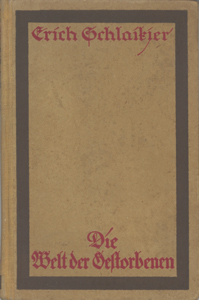 Schlaikjer, Erich: Die Welt der Gestorbenen. Ein Beitrag zu okkulten Problemen. Verlag der Täglichen Rundschau, Berlin 1920. Kl.-8°. 1.-3. Tausend. 139 S., 2 Bl. OPp.