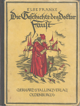 Franke, Else: Die Geschichte dess Doktor Faust. Gerhard Stalling Verlag, Oldenburg 1925. 1.-5. Tausend. Geschmückt mit 4 ganzseitigen farbigenVollbildern und vielen Initialen und Federzeichnungen, sowie farbigem Einband von Paula Jordan. 94 S., 1 Bl. farb. illustr. OHLwd.