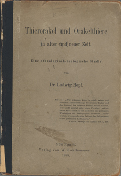 Hopf, Dr. Ludwig: Thierorakel und Orakelthiere in alter und neuer Zeit. Eine ethnologisch-zoologische Studie. Verlag W. Kohlhammer, Stuttgart 1888. XI, 1 Bl., 271 S. OHLwd.
