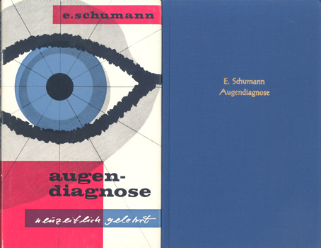 Schumann, Emmy: Augendiagnose – neuzeitlich gelehrt. Hermann Bauer Verlag, Freiburg i. Br. 1961. 3. Auflage. Fotografie: Gertrud Schmok. Mit 12 mehrfach gefalteten, teils farb. Tafeln. 80 S., 4 Bl., (Tafelteil). Goldgepr. OLwd. mit OUmschlag.