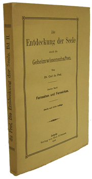 Die Entdeckung der Seele durch die Geheimwissenschaft. Zweiter Band: Fernsehen und Fernwirken. Verlag von Max Altmann, Leipzig 1922. Gr.-8°. Zweite und dritte Auflage. V, 1 Bl. (Inhalt), 295 S., 2 Bl. Vlgs.-Anz. OKarton.