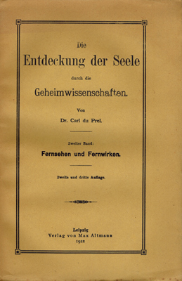 Du Prel, [Freiherr] Dr. Carl: Die Entdeckung der Seele durch die Geheimwissenschaft. Zweiter Band: Fernsehen und Fernwirken. Verlag von Max Altmann, Leipzig 1922. Gr.-8°. Zweite und dritte Auflage. V, 1 Bl. (Inhalt), 295 S., 2 Bl. Vlgs.-Anz. OKarton.