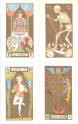 Erstausgabe, vgl. Dorbon-Ainé 5296. Kaplan “Der Tarot”, S. 248 [Ausgabe von 1969], bzw. in “The Encyclopedia of Tarot” [Band I-IV, diverse Einträge]. Zu Wirth siehe Greer “Enzyklopädie der Geheimlehren”, S. 796/797. Miers S. 662/663. Der in Brienz geborene Oswald Wirth [1860-1943], berühmter Okkultist, Magnetiseur, Astrologe, Hermetiker, Tarotforscher u. Hochgradfreimaurer, spiritueller Erbe von Ragon […]. Zeitweilig Sekretär von Sekretär von Stanislaus de Guaita. – Le Tarot stellt die Geschichte der Tarotkarten dar, wobei der ägyptische Ursprung hervorgehoben wird, sowie die Bedeutung und den Symbolismus jeder Karte, wie sie von Wirth in abgeänderten Bildern mit dem jeweils passenden Buchstaben des hebräischen Alphabets festgelegt wurden – bespricht Methoden der Deutung und Wahrsagung. – Exemplar an einer Ecke minimal bestoßen, Rücken gering ausgeblichen, leicht berieben. Schnitt lichtgebräunt, vord. Vorsatz oben wenig knickspurig, sonst ein gutes u. sauberes Exemplar. – Dazu: Le Tarot des imagiers du Moyen Age. Restitué dans l’esprit de son symbolisme par Oswald Wirth, Paris 1926. Planchees. Nouvelle édition, dessins copiés par Georg Alexander, Küsnacht-Zürich 1960. [23 farbige Karten in Faltkartonage. “Reprint” nach der Ausgabe “Le Symbolisme, Paris 1926.] (Ohne die im Original beigelegten Karten!).