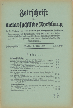 Zeitschrift für metapsychische Forschung. In Verbindung mit dem Institut für metapsychische Forschung. [Jahrgang 1930 (=1. Jg.), 2. u. 3. Heft (in einem Heft)]. [Eigen] Verlag Prof. Dr. Christoph Schröder, Berlin Lichterfelde-Ost [24. März] 1930. Gr.-8°. Herausgegeben mit Unterstützung durch Dr. Emil Mattiesen [Gehlsdorf-Rostock]. S. 41 bis 88 OKarton.