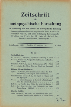 Zeitschrift für metapsychische Forschung. In Verbindung mit dem Institut für metapsychische Forschung. [Jahrgang 1931 (=2. Jg.), 8. Heft]. [Eigen] Verlag Prof. Dr. Christoph Schröder, Berlin Lichterfelde-Ost [15. August] 1931. Gr.-8°. Herausgegeben mit Unterstützung durch Dr. Emil Mattiesen [Gehlsdorf-Rostock]. S. 233 bis 264 OKarton.