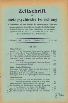 Zeitschrift für metapsychische Forschung. In Verbindung mit dem Institut für metapsychische Forschung. [Jahrgang 1931 (=2. Jg.), 9./10. Heft (in einem Heft)]. [Eigen] Verlag Prof. Dr. Christoph Schröder, Berlin Lichterfelde-Ost [1. Oktober] 1931. Gr.-8°. Herausgegeben mit Unterstützung durch Dr. Emil Mattiesen [Gehlsdorf-Rostock]. S. 265 bis 312 OKarton.