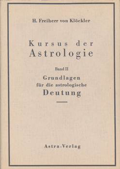 Klöckler, H(erbert) Frhr. von: Kursus der Astrologie. Band II. Grundlagen für die astrologische Deutung. Mit vielen Beispielen und 23 Abbildungen im Text. Astra Verlag, Berlin 1952. 3., um ein ausführliches Nachwort erweiterte Auflage. 263 S. schwarzer OLwd. mit weißer Prägung, OUmschlag.