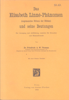 Thomas, Dr. Friedrich A. W.: Das Elisabeth Linné-Phänomen (sogenanntes Blitzen der Blüten) und seine Deutungen. Zur Anregung und Aufklärung, zunächst für Botaniker und Blumenfreunde. Verlag von Gustav Fischer, Jena 1914. Gr.-8°. Mit einer kleinen Farbtafel. 51 S., 1 Bl., 1 Bl. Vlgs.-Anz. OBroschur.