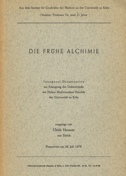 Heusser, Ulrich: Die frühe Alchimie. Dissertationsdruck Hansen, Köln 1976. 113 S., 1 Bl. OKarton.