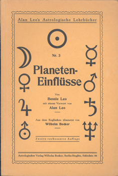 Planeten-Einflüsse. Mit einem Vorwort von Alan Leo. Aus dem Engl. Übers. von Wilhelm Becker. Bln.-Steglitz, Astrologischer Vlg. Wilhelm Becker o.J. 2. verb. Aufl. 100 S., 2 Bl. Vlgs.-Anz. OKart.