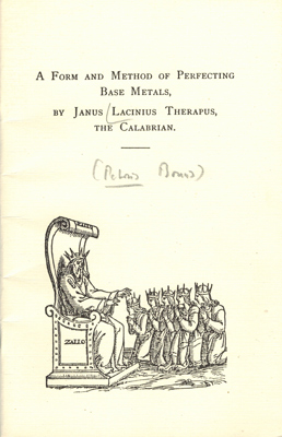 Janus Lacinius Therapus, The Calabrian: A Form and Method of Perfeccting Base Metals. The Alchemical Press, Edmonds 1983. 29 S. illustr. OKarton.