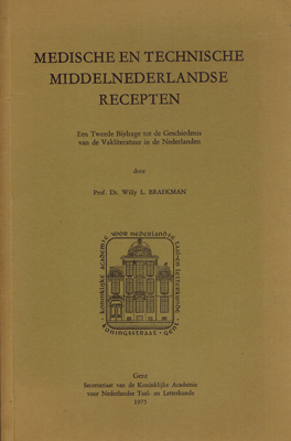 Braekman, Prof. Dr. Willy L.: Medische en technische Middelnederlandse Recepten. Een Tweede Bijdrage tot de Geschiedenis van de Vakliteratuur in de Nederlanden. Secretariaat van de Koninklijke Academie voor Nederlandse Taal- en Letterkunde, Gent 1975. Gr.-8°. XI, 423 S. OKarton.