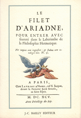 Le Filet d’Ariadne. Pour entrer avec seureté dans le Labyrinthe de la Philosophie Hermétique. J.-C. Bailly, Paris 1984. 1 (w), 14 Bl., 2 (w), 4 Bl., 176 S., 15 Bl. (Table des matieres), 1 (Falttafel), 1 Bl., 1 (w), 1 Bl., 1 (w) illustr. OKarton: