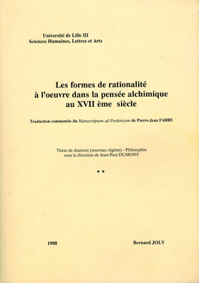 Joly, Bernard: Les formes de rationalité à l’oeuvre dans la pensée alchimique au XVII ème siècle. 2 Bände. Université de Lille III, o.O. [Villeneuve-d’Ascq] 1988. 4° [204x292 mm]. Traduction commentée du Manuscriptum ad Fredericum de Pierre-Jean Fabre [de Castelnaudary (auch: Petri Johannis Fabri, Faber)]. Thèse de doctorat (nouveau régime) – Philosophie sous la direction de Jean-Paul Dumont. 1 (w), 234 S., 1 (w); 1 (w), 1 Bl. S. [235]-423, 1 Bl., 1 (w) OKarton Bände.