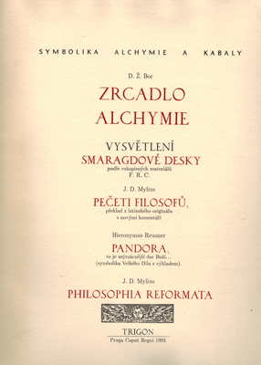 Symbolika, Alchymie a Kabaly. – Enthält weiterhin Beiträge bzw Auszüge aus: Vysvetlení Smaragdové Desky. Preklad z knihy “Geheime Figuren der Rosenkreuzer, aus dem 16ten und 17ten Jahrhundert”, podle rukopisných materiálu F. R. C., Titelblatt farbig. Johann Daniel Mylius: Peceti Filosofu, preklad z latinského originálu s novými komentári, mit 160 s/w Abbildungen und deren Beschreibung. Hieronymus Reusner: Pandora, to je nejvzácnejsí dar Bozi… (Symbolika Velkého Díla s výklladem), Titelblatt farbig und 19 s/w Abbildungen, S. 161-181. Johann Daniel Mylius: Philosophia Reformata, Titelblatt s/w und Abbildungen 182-244 und deren Beschreibung. Auszug aus: Johann de Monte Raphaim “Nekteré Poucky pro Zaky Prírody”. – Exemplar leicht berieben und bestoßen, sonst gutes Exemplar.