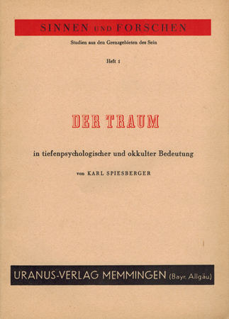 Spiesberger, Karl: Der Traum in tiefenpsychologischer und okkulter Bedeutung. Uranus-Verlag, Memmingen 1950. 31 S. OBrosch.