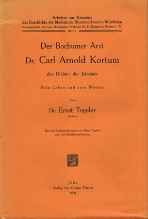 Der Bochumer Arzt Dr. Carl Arnold Kortum, der Dichter der Jobsiade. Sein Leben und Wirken. Verlag von Gustav Fischer, Jena 1931. Gr.-8°. Mit drei Federzeichnungen von Heinz Tegeler und vier Schriftverzeichnissen. 2 Bl., 68 S. OKarton.