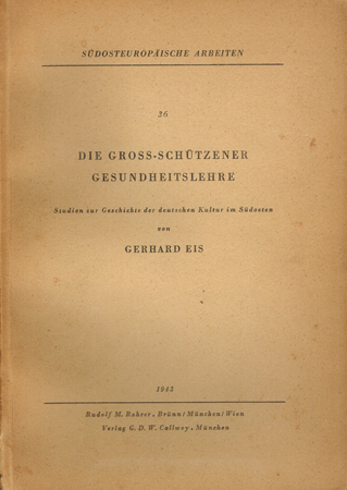 Eis, Gerhard: Die Groß-Schützener Gesundheitslehre. Studien zur Geschichte der deutschen Kultur im Südosten. Rudolf M. Rohrer, Brünn / München / Wien 1943. Gr.-8°. 180 S. OKarton.