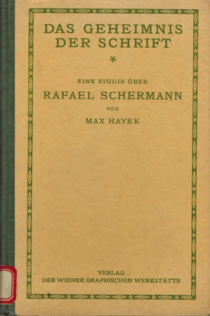 Hayek, Max: Das Geheimnis der Schrift. Eine Studie über den Graphologen Rafael Schermann. Verlag der Wiener Graphischen Werkstätte, Leipzig u. Wien 1923. 159 S. OHLwd.