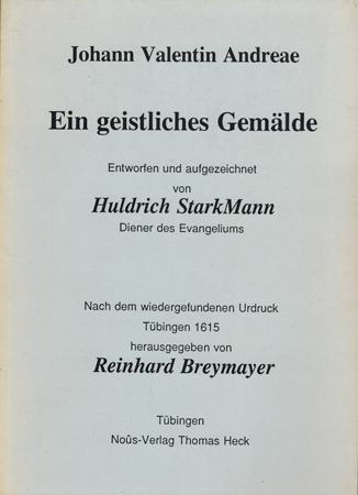 Johann Valentin Andreae. Ein geistliches Gemälde. Entworfen und aufgezeichnet von Huldrich StarkMann, Diener des Evangeliums. Nach dem wiedergefundenen Urdruck, Tübingen 1615. Noûs-Verlag Thomas Heck, Tübingen 1991. 1. Auflage. LXXXIII, 2 Bl., 77 S., 2 (w) OKarton.