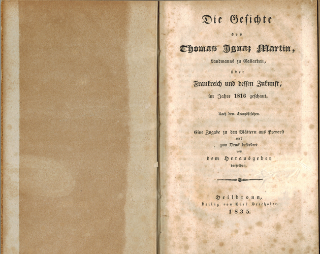Die Gesichte des Thomas Ignaz Martin, Landmanns zu Gallardon, über Frankreich und dessen Zukunft; im Jahre 1816 geschaut. Verlag von Carl Drechsler, Heilbronn 1835. [Erste Auflage]. Nach dem französischen. IV, 56 S. (Paginierung springt von Seite 12 zu Seite 17, richtig 52 S.) Pappband mit Geweberücken.