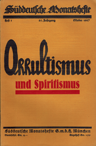 Großdeutsche Arbeitsgemeinschaft der Süddeutschen Monatshefte (Hrsg.): Okkultismus und Spiritismus (in: Süddeutsche Monatshefte, Heft 1, 25. Jahrgang). Verlag der Südd. Monatshefte, München (Oktober) 1927. Gr.-8°. XVI, 80 S., 2 Bl. (XVII-XX) OKarton.