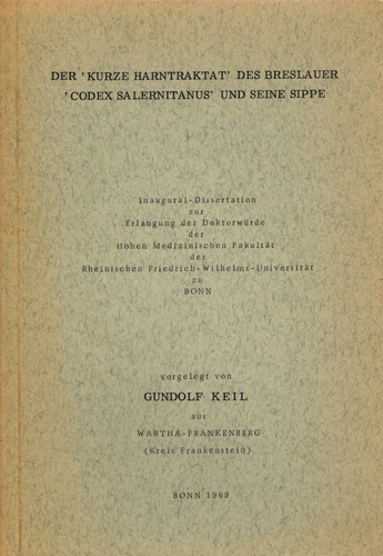 Keil, Gundolf: Der ‘Kurze Harntraktat’ des Breslauer ‘Codex Salernitanus’ und seine Sippe. Medizinhistorisches Institut der Universität Bonn, Bonn 1969. 64 S., 1 Bl. (Lebenslauf) OKarton.