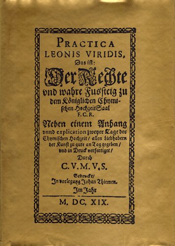 C. V. M. V. S.: Practica Leonis Viridis, Das ist: Der Rechte und wahre Fussteig zu dem Königlichen Chymischen HochzeitSaal F. C. R. Neben einem Anhang unnd explication zweyer Tage der Chymischen Hochzeit, allen Liebhabern der Kunst zu gute an Tag gegeben, und in Druck verfertiget. O.V., O.O. u. O.J. ([Rotterdam um 1980]. 152 S. schmuckloser (blauer) OPp. mit OUmschlag.