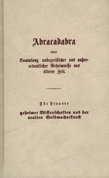 Abracadabra. Sammlung unbegreiflicher und außerordentlicher Geheimnisse aus älterer Zeit. Für Freunde geheimer Wissenschaften und der uralten Goldmacherkunst. Vollständiger, originalgetreuer Nachdruck der Ausg. Cöln o.J. Freiburg im Breisgau, Aurum Vlg. 1978. 2 Bl., 160 S. OKunstldr.