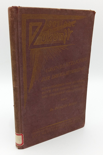 Boos, Dr. Roman: Soziale Zukunft. Grundsätzliches zur Dreigliederung. Der Kommende Tag A.-G. / Verlag, Stuttgart 1921. 1.-3. Tausend. Gr.-8°. Herausgegeben vom Schweizer Bund für Dreigliederung des sozialen Organismus. 4 Bl., 176 S. OPp.