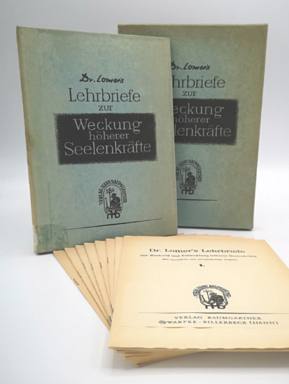 Dr. Lomer´s Lehrbriefe zur Weckung höherer Seelenkräfte. Verlag Hans Baumgartner, Warpke – Billerbeck 1950. Neu bearbeitete und vervollständigte Ausgabe. 15, 15, 18, 20, 23, 22, 20 S. OBroschuren im Pappumschlag im Schuber.