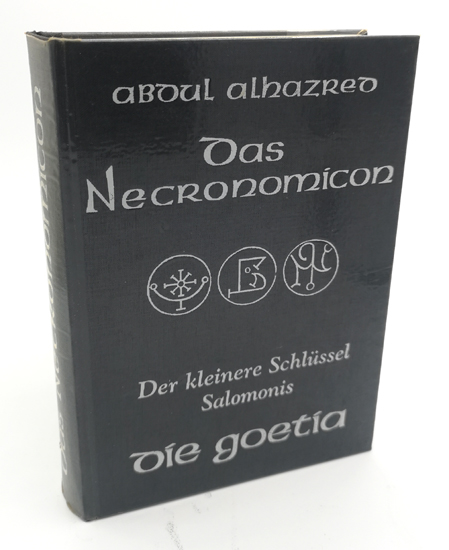 Alhazred, Abdul: Das Necronomicon. & Die Goetia oder Der kleinere Schlüssel Salomonis. [2 Teile in 1 Band]. Verlag Richard Schikowski, Berlin 1980. Mit zahlreichen Textabbildungen. 219, 1 (w).; 130 S., 1 Bl. Verlagsanzeigen. Schwarzer illustrierter OLeinwand-Band mit Prägung.