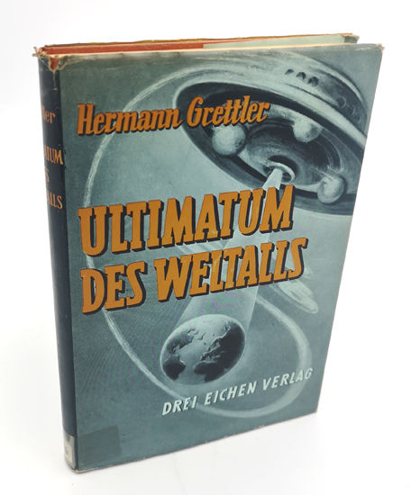 Grettler, Hermann: Ultimatum des Weltalls. Roman um das Sein oder Nichtsein der Menschheit. Drei Eichen Verlag, München 1955. 212 S., 2 Bl. OLwd. mit Goldprägung und OUmschlag.