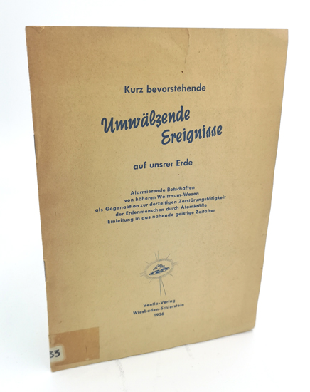 Kurz bevorstehende Umwälzende Ereignisse auf unserer Erde. Alamierende Botschaften von höheren Weltraum-Wesen als Gegenaktion zur derzeitigen Zerstörungstätigkeit der Erdenmenschen durch Atomkräfte. Einleitung in das nahende geistige Zeitalter. Ventla-Verlag, Wiesbaden-Schierstein 1956. 7 S. OBroschur.