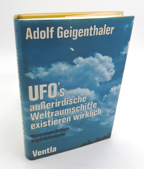 Geigenthaler, Adolf: UFOs, außerirdische Weltraumschiffe existieren wirklich. Fach- und Lehrbuch der Ufologie mit Einführung in Grundlagen der Superphysik und Esoterik. Ventla-Verlag, Wiesbaden 1976. Mit farb. Abb. auf Kunstdruck. 311 S. OKunstleder mit Rückengoldprägung und OUmschlag.